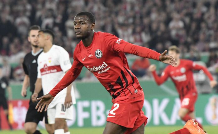 Frankfurt's French defender Evan N'Dicka celebrates scoring the 1-1 goal with his team-mates during the German Cup (DFB Pokal) semi-final football match VfB Stuttart v Eintracht Frankfurt in Stuttart, southern Germany on May 3, 2023. (Photo by THOMAS KIENZLE / AFP) / DFB REGULATIONS PROHIBIT ANY USE OF PHOTOGRAPHS AS IMAGE SEQUENCES AND QUASI-VIDEO. (Photo by THOMAS KIENZLE/AFP via Getty Images)