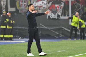 Edoardo Bove reacts after scoring lone goal in Roma’s first leg win over Bayer Leverkusen