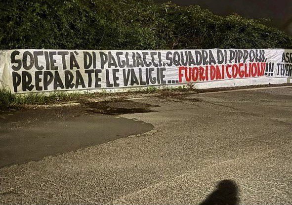 “Club of clowns, team of bums, pack your bags…get the f*** out!!!” reads the message, signed by the Tevere ultras.